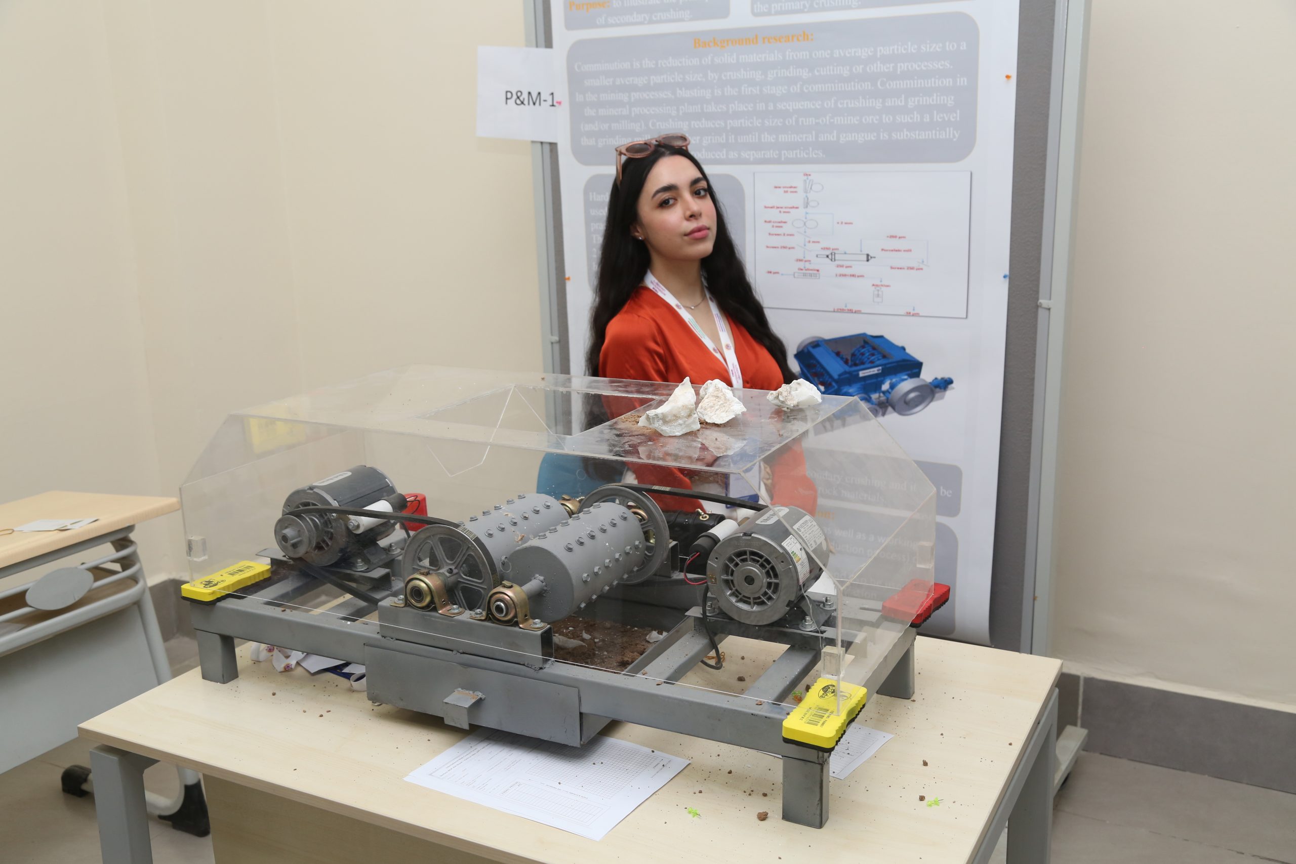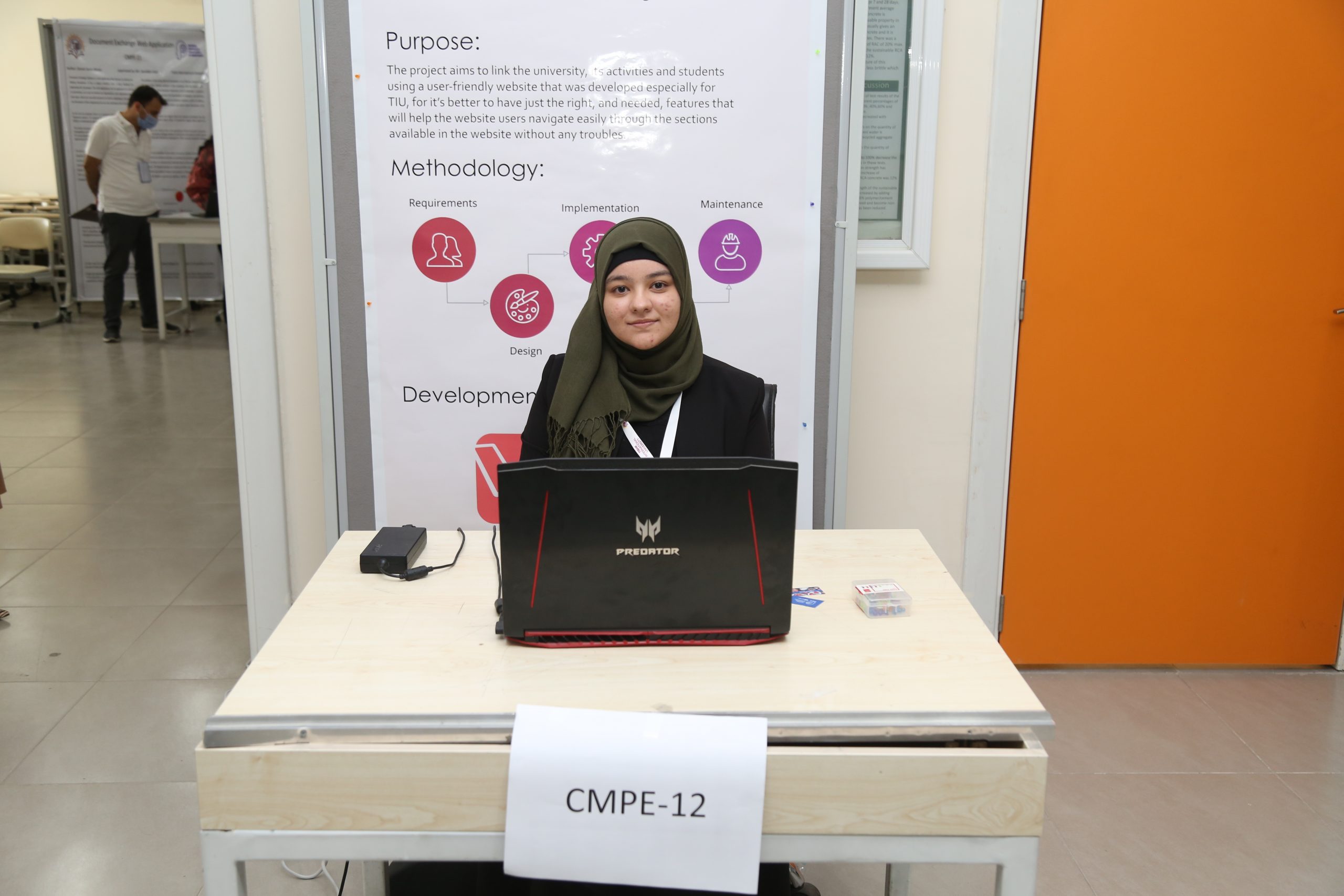 The participating students and the evaluating jury members were directed to the registration desks located in the main building entrance to receive their badges, lunch cards, program flow, and assigned codes for their stands.